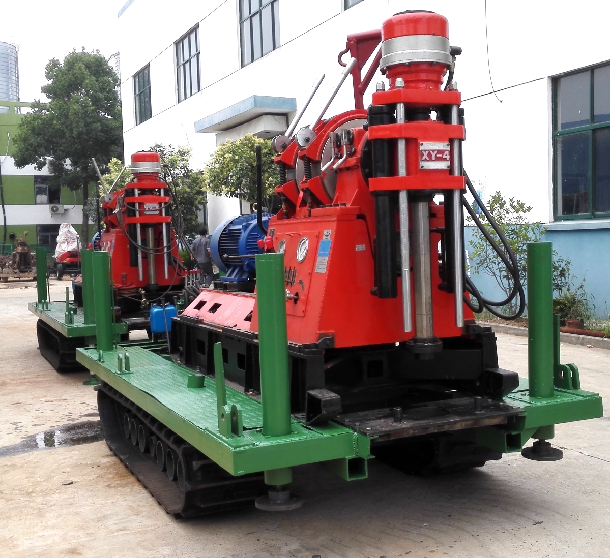 該總成裝有大型聯(lián)合收割機(jī)橡膠履帶行走機(jī)構(gòu)和行走操縱系統(tǒng),配套柴油機(jī)、鉆機(jī)橫梁、4組大液壓油缸調(diào)平衡支撐腿、工作平臺和鉆塔系統(tǒng)(2組主塔腿、2組付塔腿、起落塔裝置、雙滑輪天車、多組主付腿橫拉支撐)組成。該系列產(chǎn)品行走平穩(wěn),轉(zhuǎn)向靈活,采用幾型高架底盤,野外通過性能好。